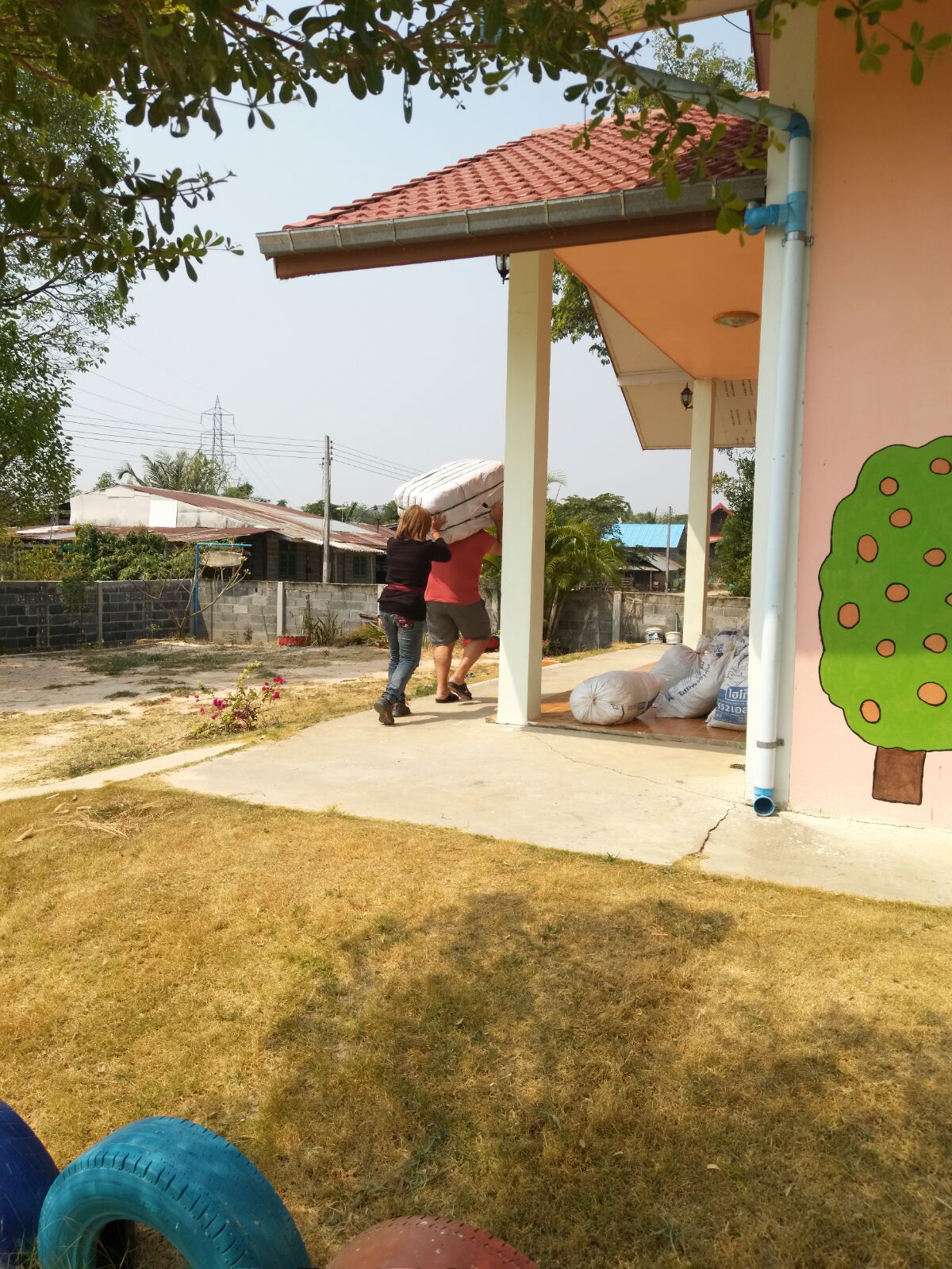 There was many helpers to load the bags in Khun Han . . . but only me and Tabisak to offload the bags back at Kanthararom Church but it was a good gym workout.